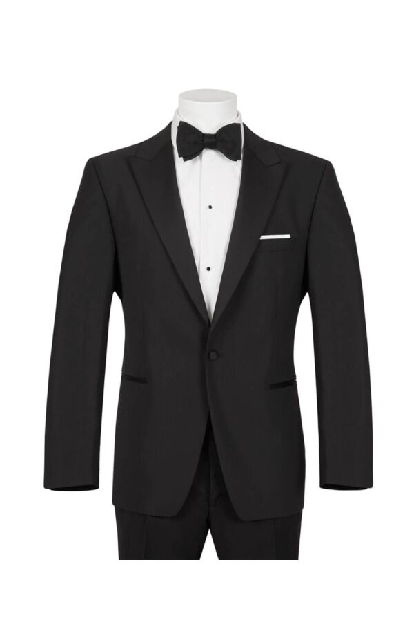 The satin peak lapels add a note of formality and distinction, framing the chest and shoulders to enhance the wearer’s natural shape with confidence and class.