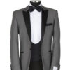 The elegant grey tone pairs seamlessly with a crisp white dress shirt, a silk tie or bow tie, and polished leather shoes for a distinguished and modern appearance.